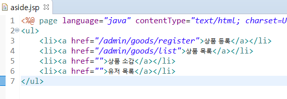 그리고 aside.jsp에 상품목록으로 이동할 수 있도록 링크를 추가합니다.